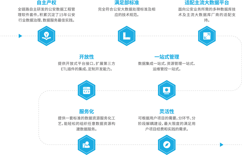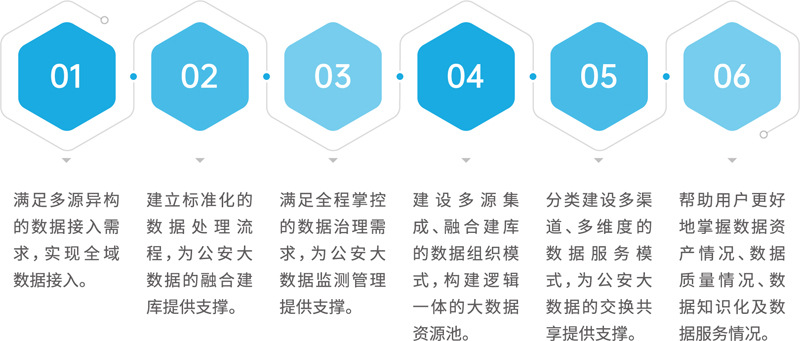 大數(shù)據(jù)治理工程以“六個統(tǒng)一”為目標,落地“四化”原則,遵循《公安大數(shù)據(jù)處理技術要求》,具備數(shù)據(jù)接入 數(shù)據(jù)處理、數(shù)據(jù)治理、數(shù)據(jù)組織、數(shù)據(jù)服務五大能力,通過對數(shù)據(jù)資源的智能處理和規(guī)范組織,形成數(shù)據(jù)增值和數(shù)據(jù)抽象能力;通過建立集數(shù)據(jù)標識、數(shù)據(jù)分析、數(shù)據(jù)挖掘為一體的計算引擎,形成跨部門、跨系統(tǒng)、跨業(yè)務的智能 數(shù)據(jù)服務能力;通過對數(shù)據(jù)全生命周期的精細化治理,形成“總關聯(lián)、總索引、總導航”的數(shù)據(jù)資產(chǎn)化管理能力。